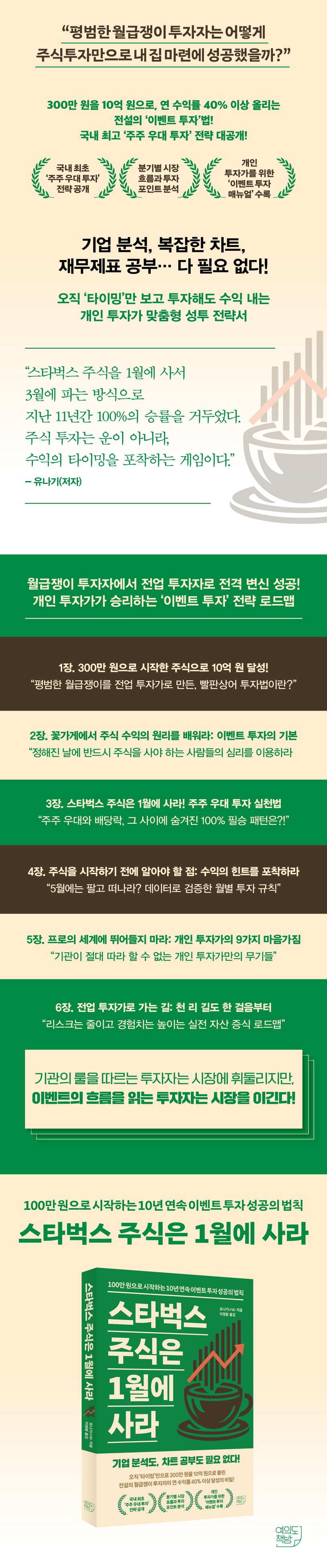 기업분석도,차트공부도필요없다!오직‘타이밍’만으로300만원을10억원으로불린전설의월급쟁이투자자의연수익률40%이상달성의비밀!“스타벅스주식을1월에사서3월에팔기만하면수익을올릴수있는데,왜다들그렇게하지않을까요?”“아,그런가요?그거재미있는데책으로출간해보시지않겠습니까?”이짧은문답이『스타벅스주식은1월에사라』의시작이었다.저자유나기는1999년미국실리콘밸리에서근무하며주식투자에입문했다.IT버블붕괴로쓰라린실패를맛본그는,시장의거대한파도속에서‘이벤트투자’라는독자적인기법을터득하며투자에성공하게된다.스타벅스주식을1월에사서3월에파는단순한원리로시장의패턴을포착하는이전략은,평범한직장인이었던그를전업투자자로성공시켰고,주식투자만으로삶의기반을일구게만들었다.‘이벤트투자’란어떤것일까?저자는사람들이믿고따르는일반적인투자상식과기법이사실거대자본을굴리는‘기관투자자’를위한것이라고지적한다.그래서자본과정보력이부족한개인투자가가이것을곧이곧대로믿고투자했다가는실패할확률이크다는전제에서이책을시작한다.저자는단순히적은돈으로일확천금을벌었다는주장으로전문가행세를하지않는다.그는일본의저명한주식배틀에서우승을거머쥐고전문지선정‘연간MVP’에이름을올리며실력을입증받은고수다.이책은그전문성을바탕으로실전시세에서이기는‘이벤트투자’비법을오롯이담았다.또한최근국내시장의화두인‘주주우대제도’활용법을심도있게다룬다.오뚜기,달바글로벌,비상교육등점차많은기업이주주우대혜택을강화하는추세다.‘코스피5000’을목표로주주환원정책이더욱각광받는지금,일본시장에서검증된저자의노하우는한국의투자자들에게시장의흐름을먼저읽고선점하는강력한무기가되어줄것이다.“기관의룰을따르는투자자는시장에휘둘리지만이벤트의흐름을읽는투자자는시장을이긴다”꽃가게에서배운시장의원리부터개인투자가로승리하는마음가짐까지『스타벅스주식은1월에사라』는총6장에걸쳐,전업투자자로성공한저자의경험과노하우를보여준다.1장은평범한샐러리맨이던저자가단돈300만원으로10억원의자산을일구기까지의생생한성공담을소개한다.이책의핵심인‘이벤트투자’의탄생비화가실감난다.기관투자자가절대따라할수없는틈새시장을공략해개인투자가만이누릴수있는승리의비결도공개한다.2장은주식투자를꽃가게운영에빗대어‘이벤트투자’의기본원리를알기쉽게소개한다.3장에서는11년간승률100%를기록한저자의전설적인투자법을좀더심층적으로소개한다.주주우대제도와배당락일사이에숨겨진가격변동의메커니즘을철저하게파헤친다.4장은‘5월에는주식을팔아라’,‘미국금리가오르면일본주가도오른다’등시장을지배하는다양한어노말리(이례현상)를데이터로검증한다.기관투자자들의‘윈도드레싱’효과부터요일별,월별주가패턴까지,통계적우위를점할수있는최적의매매타이밍을1년분기별로설명한다.5장은애널리스트의추천종목에속지않는법,버블을두려워하지않고즐기는법,손절매를칭찬하는역발상마인드셋을설명한다.6장은전업투자자를꿈꾸는사람들을위한현실적인로드맵을제시한다.월급쟁이샐러리맨에서경제적자유를얻은자산가로거듭나기위해지금당장실천해야할구체적인지침을소개한다.또한이책의앞부분에수록된‘주식시세의분기별포인트’와‘10년간동일한패턴을보인닛케이주가추이’그래프는매일엑셀로시세데이터를기록하며치열하게시장을분석해온저자의땀과노력이집약된핵심자료다.저자는이런핵심정보를제공할뿐아니라10년전정립한이전략이현재의한국에도유효함을강조하며,한국독자들만을위한투자비법까지아낌없이제안한다.손실과손절에지쳐시장의흐름을읽는‘진짜안목’을기르고싶은독자라면,주식투자하나로도쿄에내집을마련하고대기업을당당히퇴사해자유를얻은유나기의조언에귀기울이기를바란다.