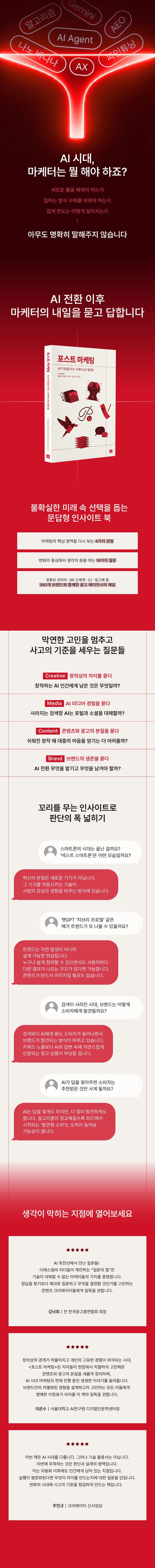 마케터가 현장에서 마주하는 현실적인 선택을 돕는 문답형 인사이트북으로, 더에스엠씨가 유튜브 코리아·CJ·빙그레 등 350여 개 브랜드 현장에서 검증한 인사이트를 4가지 관점, 16가지 핵심 질문으로 풀어냈습니다.