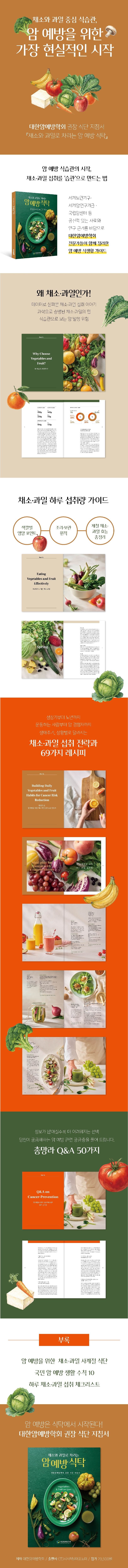 이 책의 총 4부로 구성되며, 암 예방을 위한 채소·과일 사계절 식단 및 국민 암 예방 수칙 10, 하루 채소·과일 섭취 체크리스트를 부록으로 제공한다.